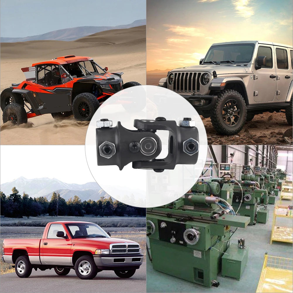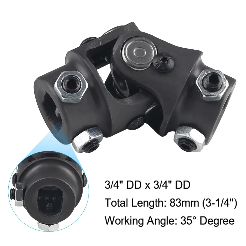 Upgrade your steering system with this Single Steering Shaft Universal U-Joint, designed to connect a 3/4” DD steering shaft to a 3/4” round shaft. Built from high-strength steel and finished in sleek black for corrosion resistance, it ensures a secure fit and smooth steering performance. Perfect for custom builds, restorations, hot rods, race cars, and off-road vehicles.